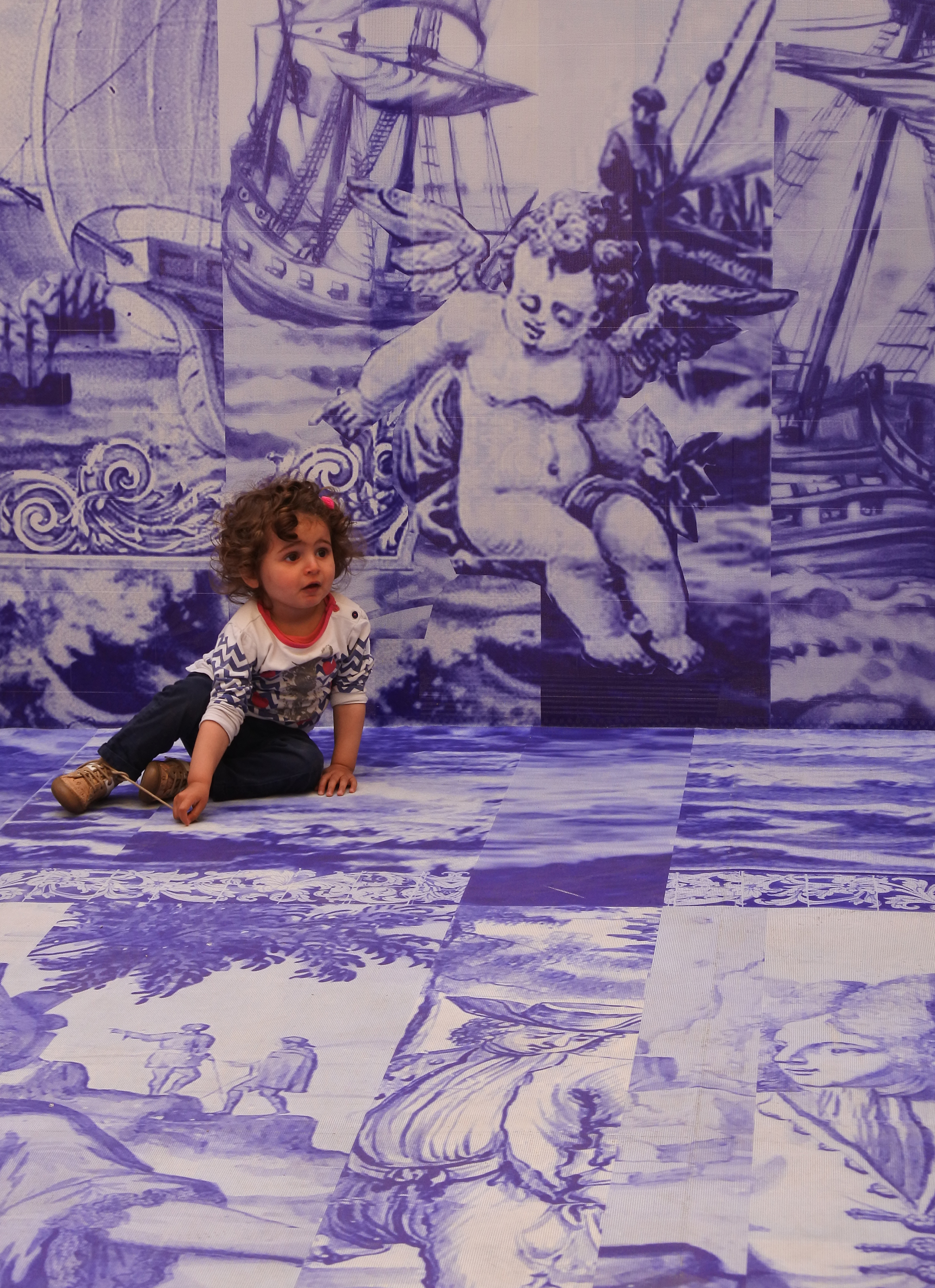 Entering a Montpellier courtyard and feeling immersed in a Portuguese landscape is the spatial experience that this installation aims to provide. The blue of the azulejos (traditional Portuguese ceramic tiles) introduces a new tone to the courtyard and carries the memory of another locality. Beauty takes shape here in the encounter of two heritage identities. This space of physical sharing manages to create a hybrid landscape that transports us. The ceramic element becomes a unit of space, and the installation adapts to the composition of the interior facades. By working with transparency, the frescoes overlap like a veil on the walls, offering a new materiality to the courtyard. With its baroque aesthetic codes, the azulejo reflects ornamental beauty in architecture. Often considered superfluous, it is the primary material of the installation here. The stories depicted in the frescoes emerge as one strolls through, allowing for a journey through contemplation.
